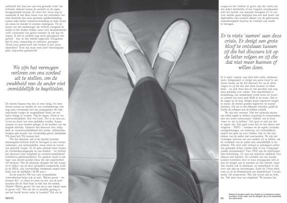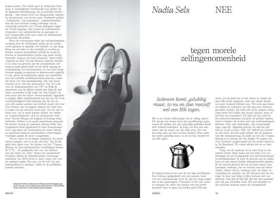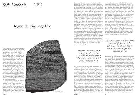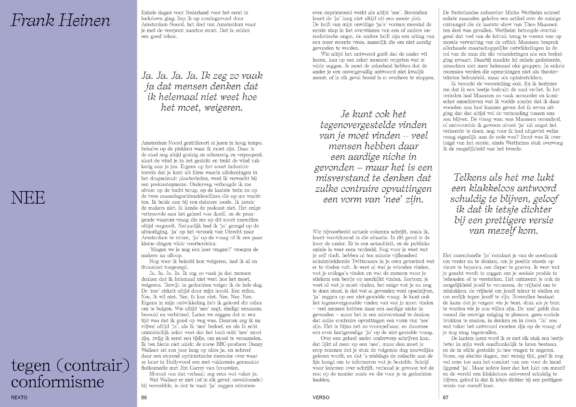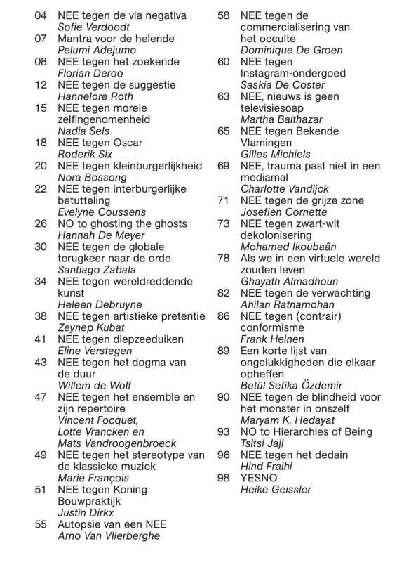 Soms moet je voorbij het empathische meedenken of het verbeelden van alternatieven, en volstaat alleen nog een klare, korte NEE. Soms moet je je resoluut ergens van afzetten om te weten waar je dan wel voor staat. Met meer dan dertig auteurs legden we een 'via negativa' af, een eigenzinnig brokkenparcours waarbij de ene NEE de andere mogelijk maakt. Het resultaat leert ons dan nee-zeggen een kunst is.