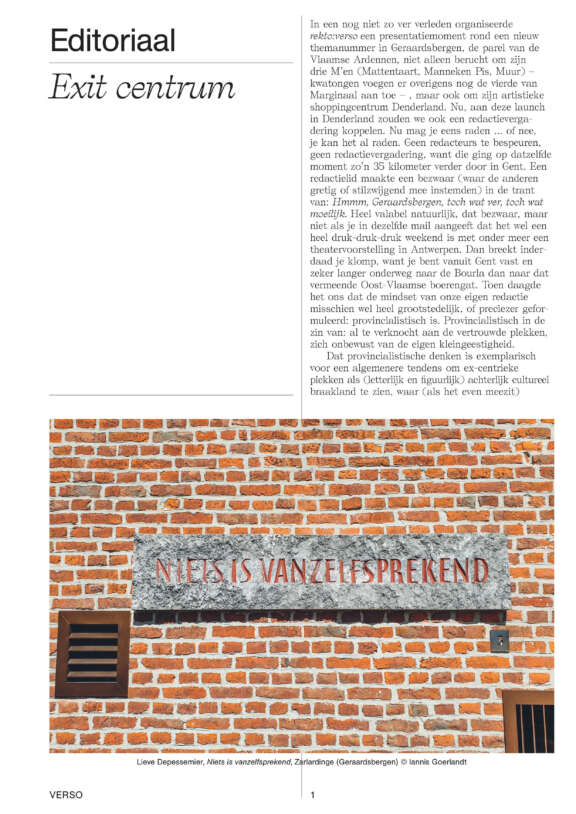 Periferie is een relationeel begrip. De periferie is zo pluriform dat ze nauwelijks nog vastgelegd kan worden. Daarom is dit themanummer een tocht, van gemeente tot gehucht, van bos tot brakke grond. Zie hier een alternatieve (culturele) cartografie van de 'diversiteit die niet in het plaatje past'.