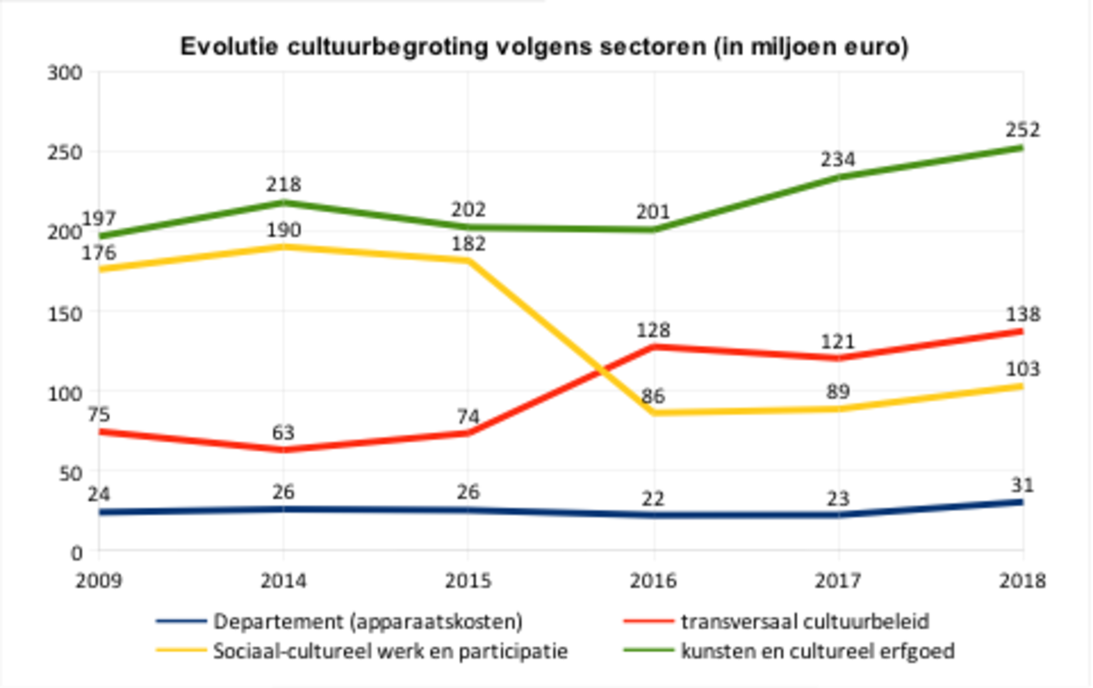 De kunsten – de analyse volgt hierna – noteren sinds 2014 een daling, met een dieptepunt in 2015 (175 miljoen), een licht herstel vanaf 2017 en in 2018 een budget van 193 miljoen, zodat deze steun vandaag hoger uitkomt dan in 2014, toen het 186 miljoen euro bedroeg. De stijging wordt verklaard door de provinciale inkanteling van 2,4 miljoen naar de structurele middelen voor de kunsten, alsook een half miljoen voor het Fonds voor de Letteren en een half miljoen voor het VAF Film.