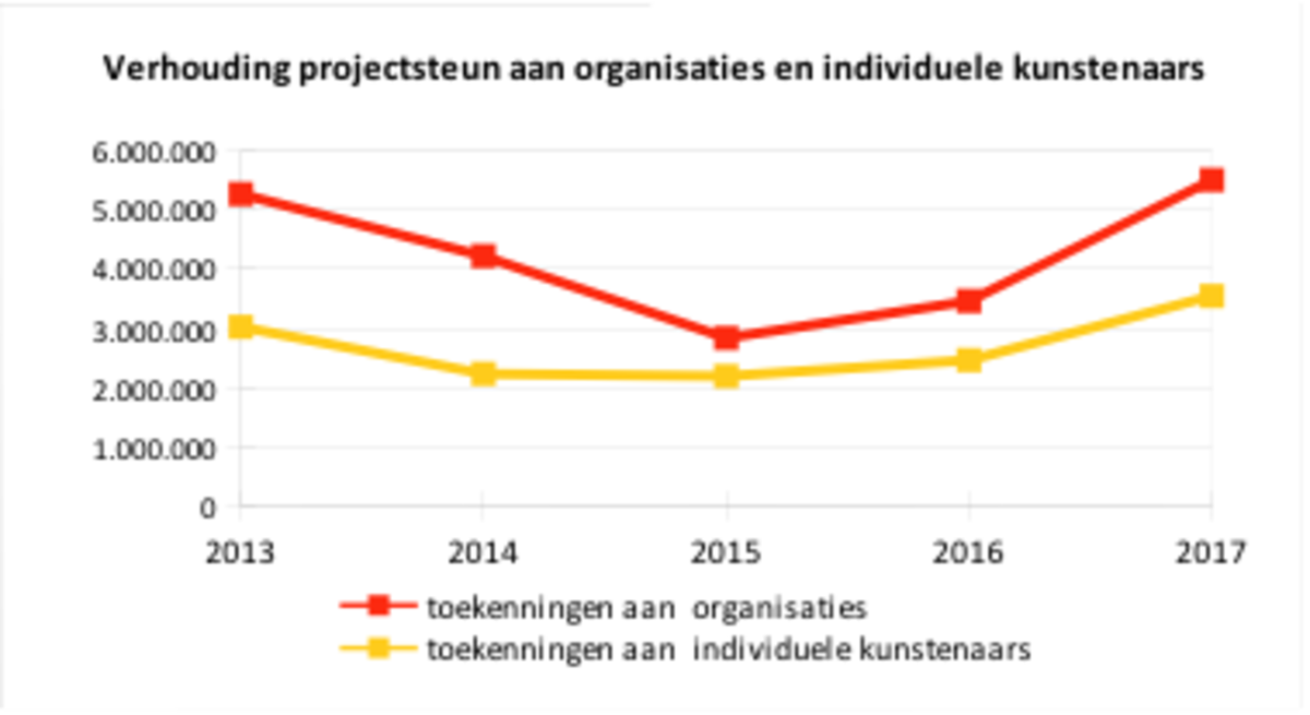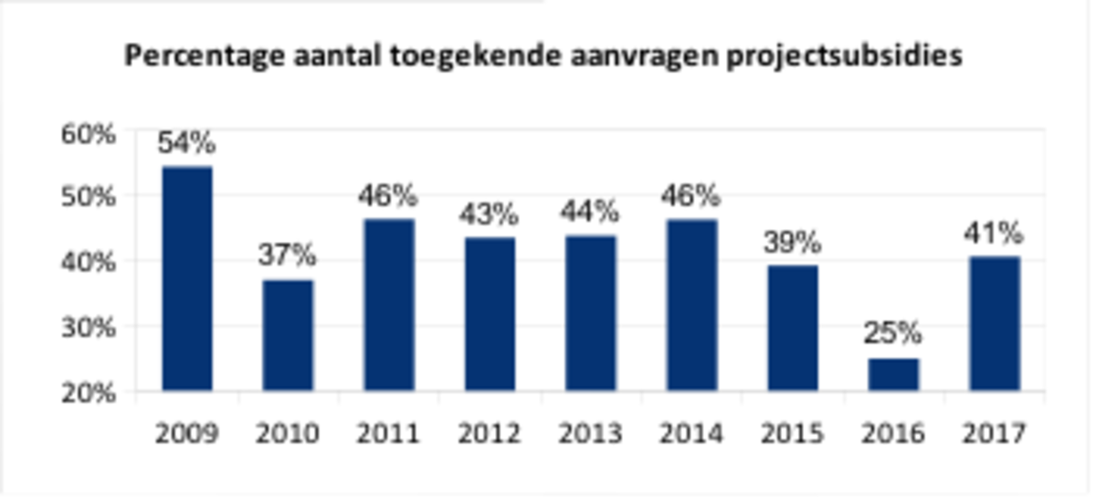 Het dieptepunt was het jaar 2016, toen slechts 25% van de aanvragen subsidie kreeg. Het budget stond op een laag peil en werd in de tweede helft van dat jaar ook aangesproken door een aantal organisaties die net uit de boot waren gevallen bij de structurele subsidies. De spanning tussen aanvragen en toekenningen is nog duidelijker in bedragen: in 2016 werd voor een bedrag van 35 miljoen aanvragen ingediend, slechts voor 6 miljoen toegekend. Amper 17% van de gevraagde bedragen werd gehonoreerd.