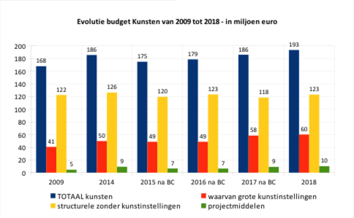 Het kunstenbudget was in 2017 gelijk aan dat van 2014. In 2018 bereikt het het hoogste niveau ooit, in absolute waarde althans (193 miljoen). Als de cijfers vanaf 2009 worden geïndexeerd, is het resultaat wel afwijkend. Dan is het bedrag van 2018 nog 2 miljoen lager dan dat van 2009 (195 miljoen euro). Zonder de overheveling van provinciale gelden zou het nog 2,4 miljoen lager zijn.