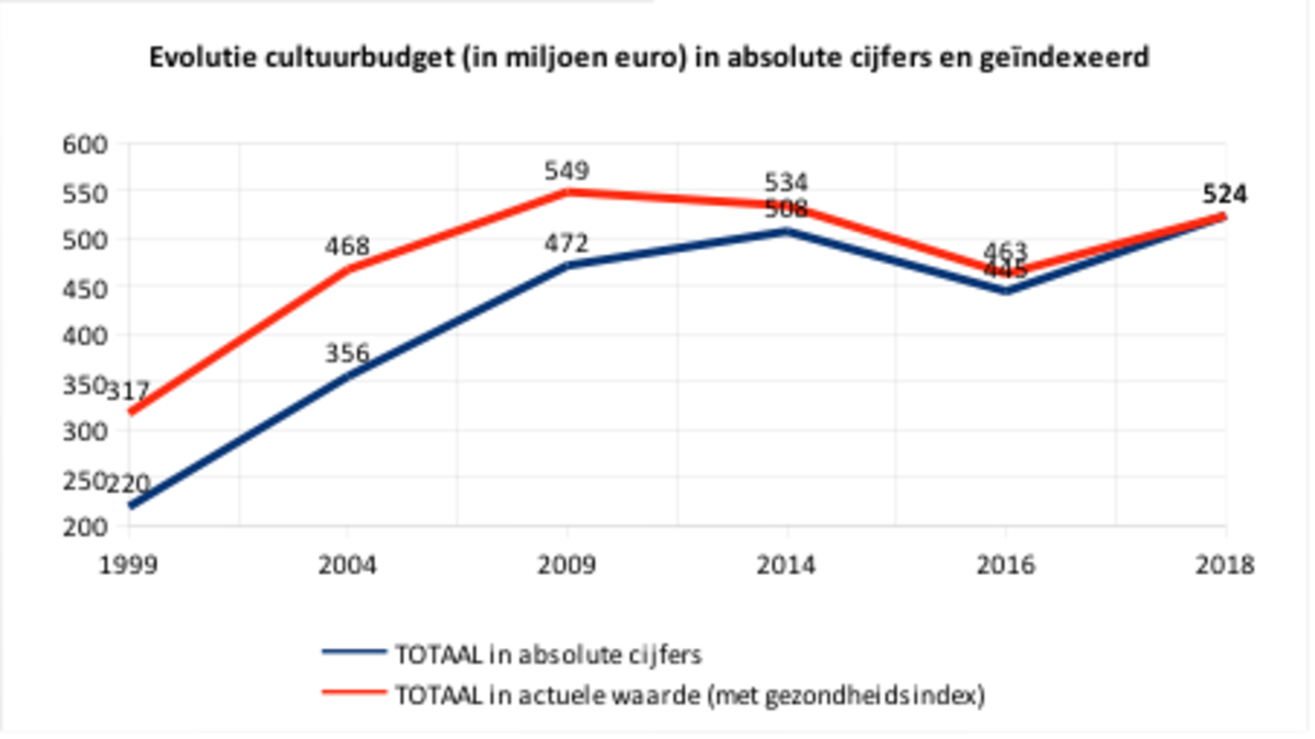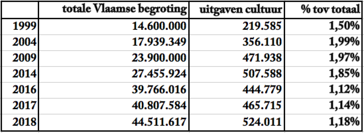 De totale Vlaamse begroting klokt in het jaar 2018 af op haar hoogste bedrag ooit, nl. 44,5 miljard euro. Het onderdeel Cultuur krijgt daarvan 524 miljoen euro, of (amper) 1,18%. Tot 2014 lag dat percentage hoger (zie tabel), maar de zesde staatshervorming zorgde voor de overdracht van een aantal bevoegdheden van het federale niveau naar het Vlaamse. Daardoor steeg het globale Vlaamse budget, maar daalde het relatieve aandeel Cultuur van 1,99% naar 1,12%. Dat laatste percentage, uit 2016, is het laagste van de voorbije 20 jaar. Vanaf 2017 is er evenwel een licht stijgende trend op te merken. Dat wijst op een voorzichtig herstel van het cultuurbudget.