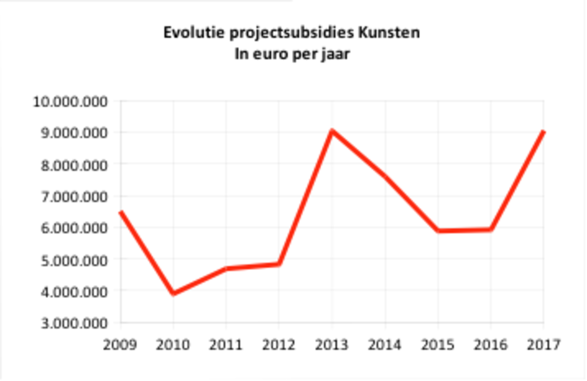 De dansende lijn toont aan dat dit budget zeer onregelmatig was, precies door de vermelde aanwending van projectmiddelen voor de tweejarige structurele subsidies. Het laagste bedrag voor projecten werd genoteerd in 2010, met 3,9 miljoen euro. Het hoogste bedrag is voorzien in 2018, nl. 9 miljoen.