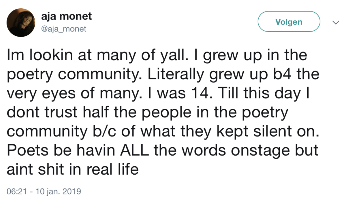 Spoken word artieste Aja Monet tenslotte deelde begin januari volgende tweet: