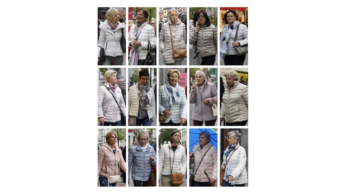 De meisjes bij Claire’s en de groepsfoto’s op het internet deden me denken aan het werk van Hans Eijkelboom, dat momenteel in het Fotomuseum van Den Haag te zien is. Gewapend met zijn camera verzamelt Eijkelboom al decennia lang beelden van mensen over heel de wereld, die allemaal dezelfde kleren dragen. Zijn collages situeren zich op het snijpunt van antropologie en fotografie. Ze vertellen ons zowel iets over de manier waarop we onze identiteit construeren als over de effecten van globalisering en McDonaldisering. Daarnaast bevestigen ze het gevoel dat je in elke winkelstraat in eender welke westerse stad intuïtief kan overvallen: blijkbaar zijn we inderdaad nog altijd allemaal doodsbenauwd voor diversiteit.