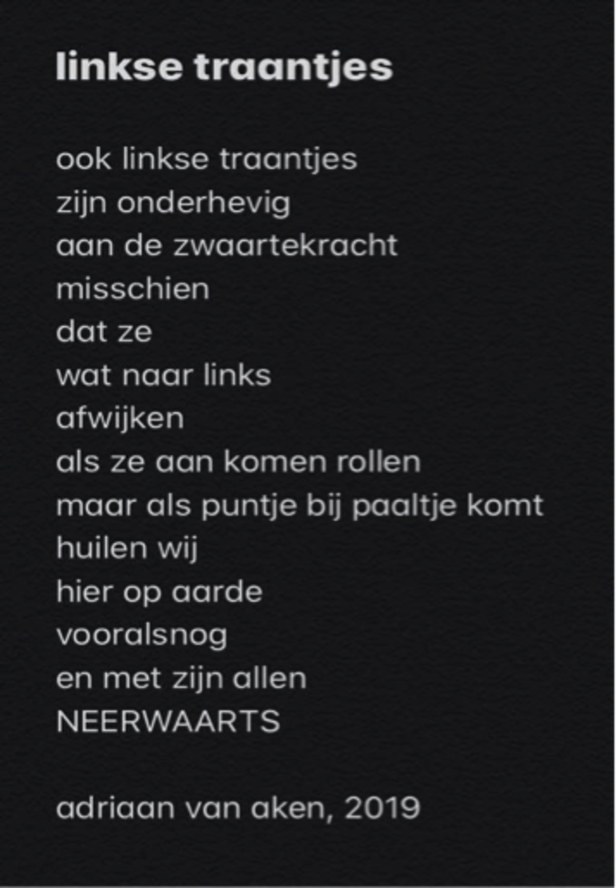 Adriaan Van Aken is lid van Het nieuwstedelijk, een theatergezelschap uit Leuven, Hasselt en Genk. Zo’n theatergezelschap, dat is iets anders dan het werk van een dichter. Dat is een bedrijf. Ze verkopen verwondering. Inzicht. Gedachten. Verbondenheid. Maatschappijkritiek. Pure Schoonheid. Ongemakkelijkheid. In Your Face Facts op een bordje van topspel.