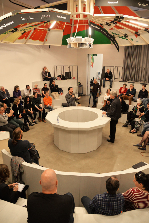 Op de houten membranen die de koepel bij elkaar houden, staan in het Kuranyi, Arabisch en Engels de zes pijlers van de revolutie: zelfbestuur, gendergelijkheid, ecologie, zelfverdediging, collectieve economie, religieuze en etnische diversiteit. De hele constructie oogt feestelijk en strijdbaar tegelijk. Het is de kleine versie van het volksparlement dat Studio Jonas Staal samen met de Democratische Zelf-Administratie van Rojava bouwde in Dërik.