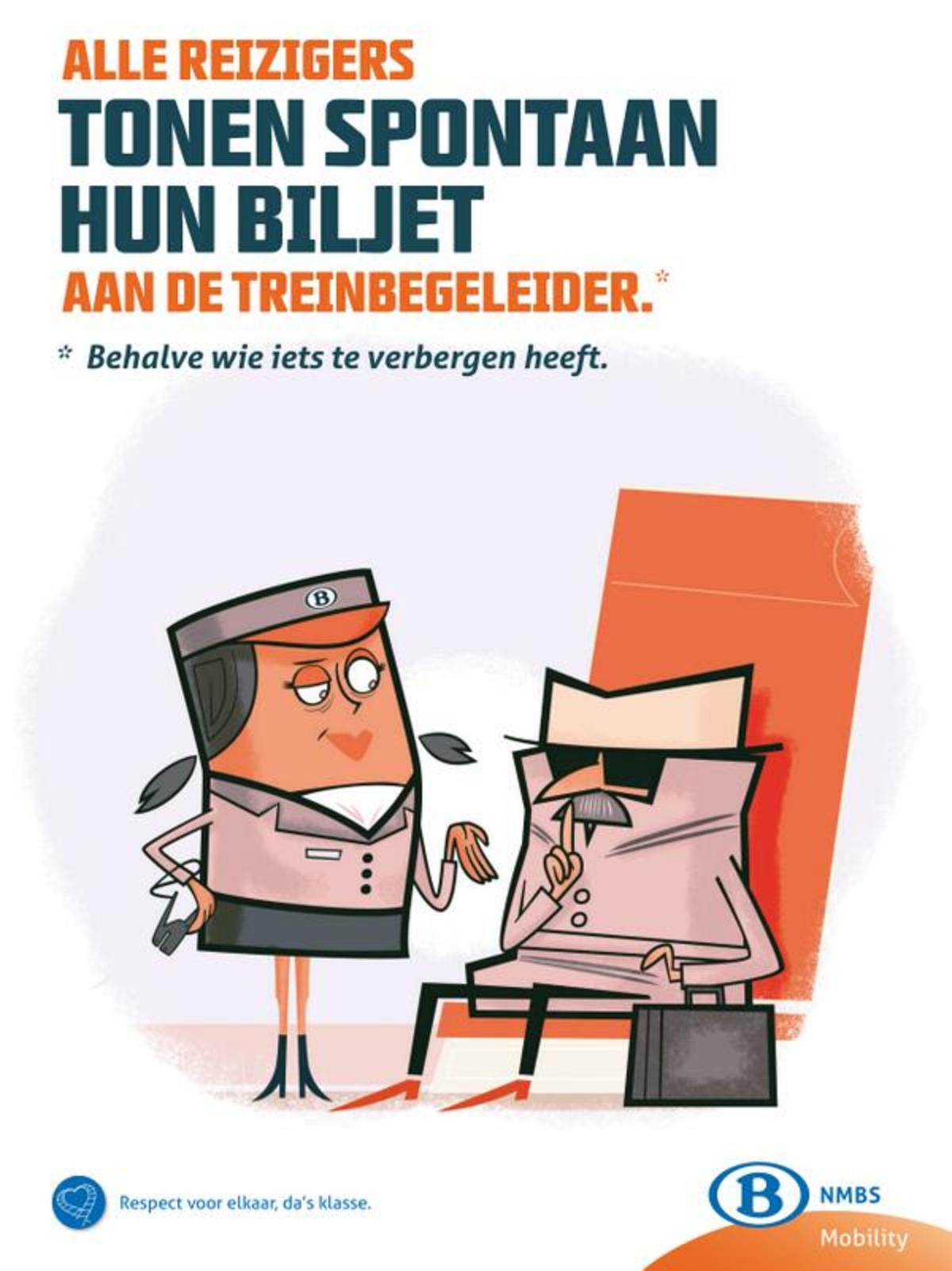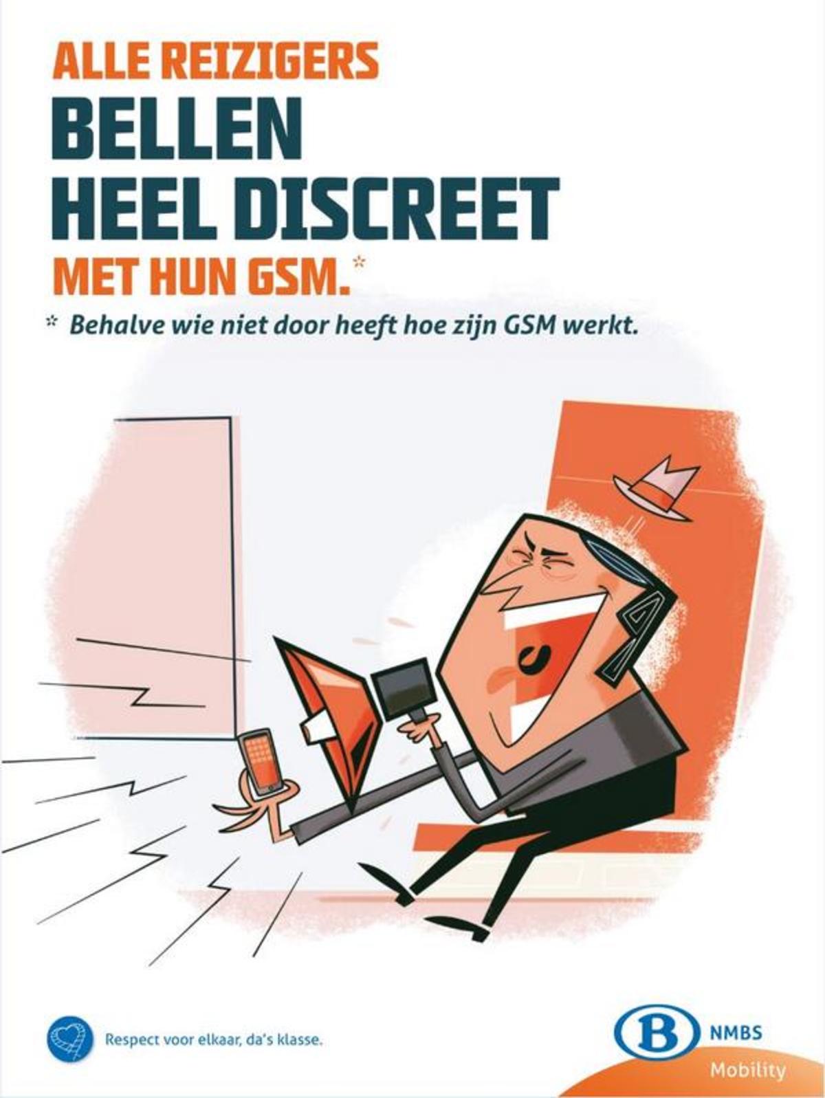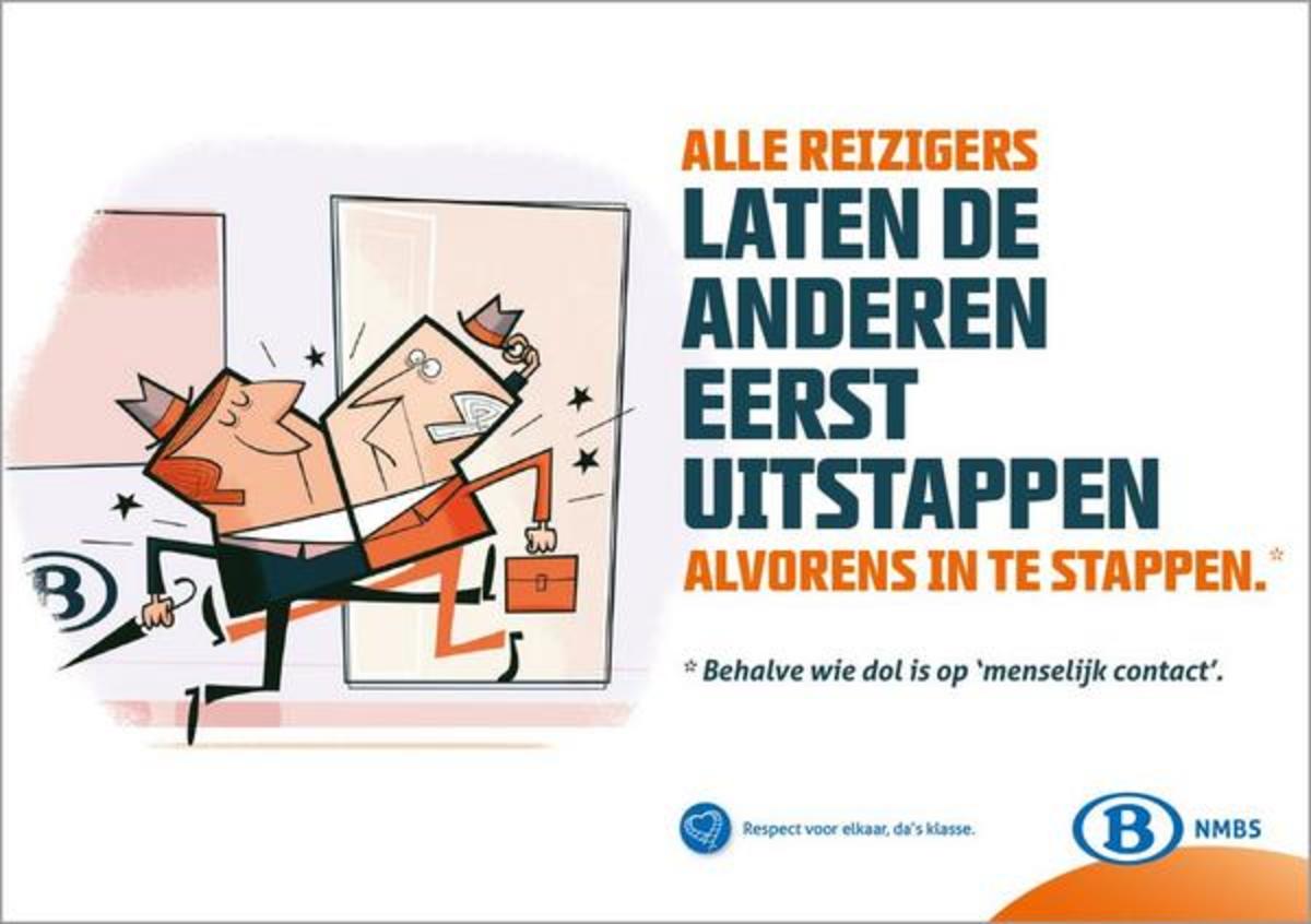 Ik was van plan om je te feliciteren. Ik dacht dat je die dwaze hoffelijkheidscampagne van de NMBS onlangs eindelijk had stopgezet. Jarenlang hebben die bordjes in de trein gehangen, en elke keer vroeg ik mij af hoe de Cel Communicatie – of wie er daarover ook moet beslissen – aan zo een dwaze, betuttelende, terminaal on-grappige en lelijke campagne haar fiat heeft kunnen geven. Ik stel het mij ongeveer zo voor: