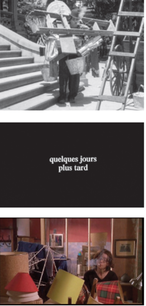 Ritmewissels in beeld en geluid stuwen het verhaal voort. Het tempo wordt aangevoerd door pianomuziek, pittige dialogen, tikmachine-geluiden, en de stokkende ademhaling die de film opent en sluit en zo als het ware de piano animeert die hoog in de lucht aan een verhuiskraan bengelt. In de gesloten ruimtes van het appartement hangt verstikking in de lucht: beeldkaders zijn volgestouwd met meubelstukken, Charlotte rookt de ene sigaret na de andere, zelfs de stofzuiger en microgolfoven braken dikke wolken zwarte rook uit. Elders ruikt het naar desinfectiemiddelen. Deze visuele vondsten zijn weinig verhulde metaforen die herinneren aan de Holocaust. Elke verschijning van rook, geur, chaos transporteert de personages terug naar Polen en naar de nooit gekende grootmoeder die het leven liet in de gaskamer. De film wisselt voortdurend tussen snelheid en stilte, tussen rust en lawaai. Halverwege verschijnt een tekstbord dat een tijdsellips aangeeft – een vertelstructuur recht uit de stille film. Herhalingen met variaties in tekst en beeld appelleren aan de traditie van de mop die bij elke overlevering een nieuwe draai krijgt, zoals Akerman in La Chambre (1972) bij elke passage van de ronddraaiende camera kleine verschuivingen ensceneert. Het gewicht van de tijd wordt komische timing als langdurige long shots opgeschrikt worden door snits. In een lang frontaal shot van een hotelkamer in Hôtel Monterey (1972) verschijnt abrupt een mens en springt het bed naar een andere hoek van de kamer dankzij een onzichtbare snit die een verrassende tijdsprong realiseert – zoals in komische trickfilms. Naast een strijd om te wonen en te bestaan, zijn zowel slapstickkomedies als Akermans films dan ook steeds een strijd met de tijd in vertellingen die niet narratief vlot of logisch zijn, maar wel episodisch, fragmentarisch, struikelend en haperend. Het stop-en-start ritme van slapstick comedy vertelt het dolende leven als een snoer van bruuske scènes.