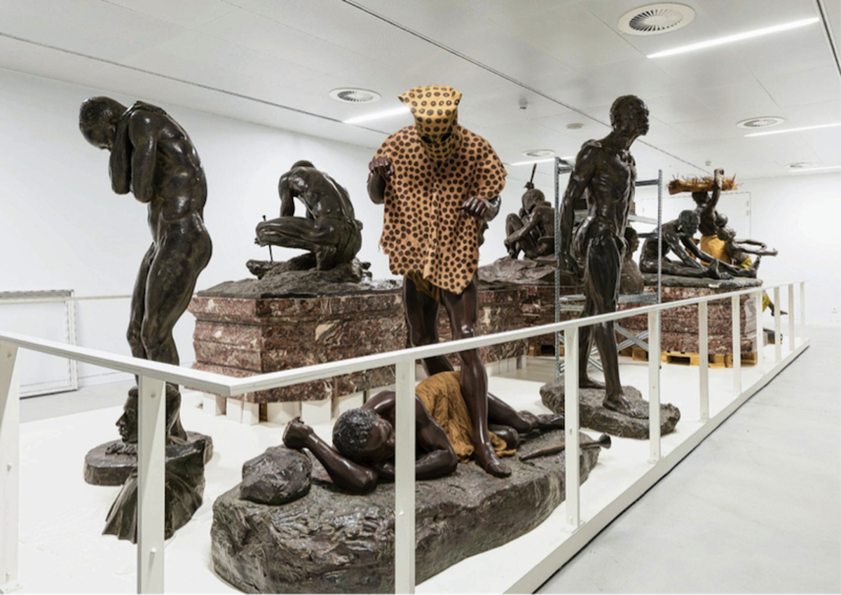 In de eerste ‘zaal’, nog net onder de grond en nog net strak ‘white gallery cube’-wit, valt in een uithoek vooral een bijzaaltje op, waar de pijnlijke koloniale standbeelden staan die vandaag als onbetwistbaar racistisch bestempeld kunnen worden. Het gaat onder meer over de beroemde Luipaardman: een beeld in brons, met een luipaardcamouflagepak in textiel, dat een luipaardman en zijn slachtoffer voorstelt.