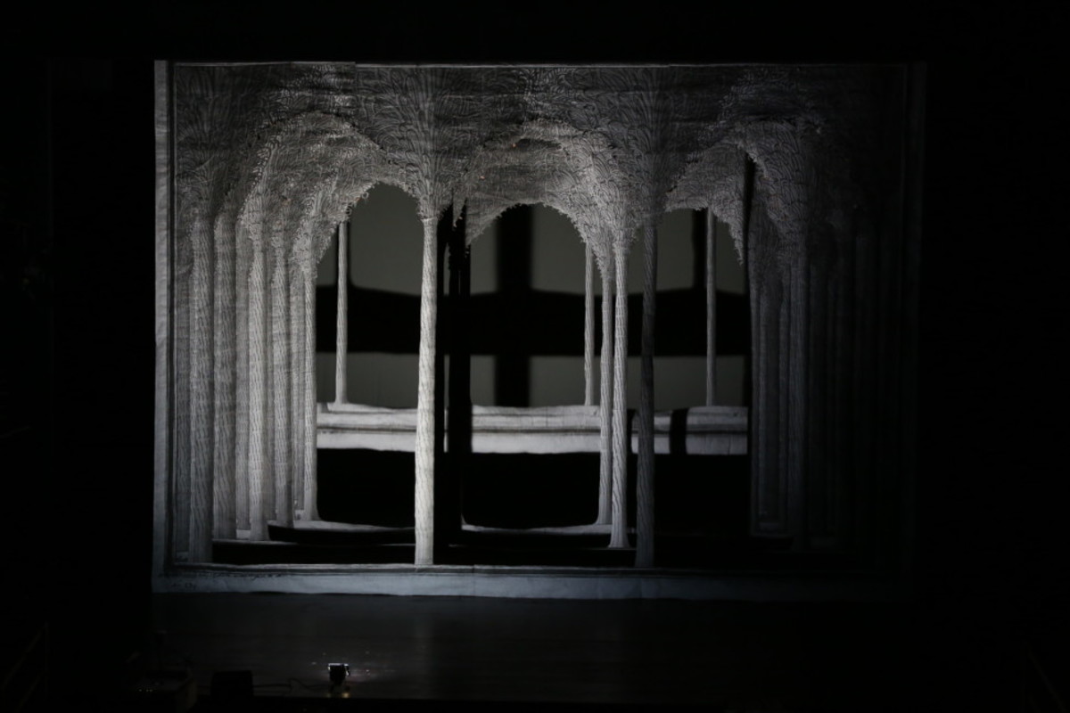 Rimah heeft zichzelf altijd fysiek op het toneel geplaatst, in de stukken die ze schreef en regisseerde. Ook in Infini #5 is ze nadrukkelijk aanwezig, maar deze keer alleen met haar stem. ‘Mensen kunnen me horen. Mijn stem is er. Ik hoef er zelf niet te staan. Wat we op het toneel zien, is al zo mooi. Dit gaat niet over mij persoonlijk. Het gaat erom mensen de eindeloosheid te laten ervaren, terwijl ze luisteren naar mijn beschrijving ervan. Intussen kijken ze naar een kathedraal van palmbomen, geïnspireerd door Bosco di Palme (1754) van de Italiaanse architect Giovanni Carlo Galli-Bibiena.’