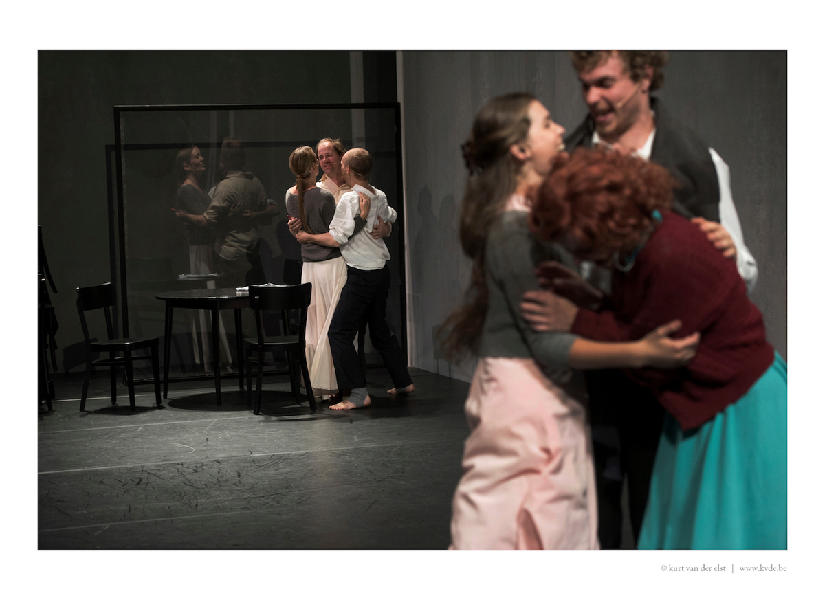 DWW geeft in de voorstelling zelf een nogal exhaustieve reeks mogelijke antwoorden op bovengenoemde vragen. Zoals ze dat wel vaker doet, maakte DWW van de eigen dramaturgische worsteling met Café Müller immers de kern van het drama: grote thema’s worden kleinmenselijk gemaakt, ideologische breuklijnen verpersoonlijkt. DWW speelt DWW presenteert zich qua titel als het magnum opus (‘magnus opus’, babbelt stagiair Rob) van een gezelschap dat inmiddels al even niet meer jong en aan- (en vooruit-)stormend is en inderdaad stilaan kan terugkijken op wat ‘een oeuvre’ aan het worden is. Anders gezegd: de artistieke kern bestaat uit veertigers met dunnend haar en groeiende kroost. Ze zijn haast een generatie ouder dan hun stagiairs, en werpen inmiddels een schaduw – of verlichten de weg, dat hangt ervan af – op theatermakers die na hen komen, zoals die stagiairs. Deze laatsten domineren aanvankelijk de voorstelling. Schijnbaar spontaan, geïmproviseerd praten de drie stagiairs honderduit, met de ernst en overgave die late jeugd kenmerkt, over hun ervaring als stagiair bij DWW, over hun dramaturgische omgang met Café Müller, over de onontkoombaarheid van het decor, over de beroemde choreografe Pina Bausch en over hun bewondering voor de drie kernleden van DWW. Intussen zit die oudere (avant-)garde, op het arrière-plan, genereus terughoudend. Denk je. Tot je merkt dat ook zij in gesprek zijn, een gesprek dat langzaam in crescendo gaat, stilaan hoorbaar wordt onder het gebabbel van de stagiairs, de gebaren die hun gesprek interpungeren lopen verrassend parallel, zij het enkele seconden vroeger, met die van de jonge garde. We hebben hier te maken met een geval van ‘voorspraak’: de jonge acteurs zeggen zo goed mogelijk na wat ze via hun ‘oortjes’ ontvangen. En dat doen ze al sinds aanvang. Dus als zich onder het jong volk een discussie ontspint wiens (of wier) idee het was om Café Müller nu eigenlijk te brengen – Vincent, Mara of Ward – is de ironie te snijden: een discussie over het intellectueel eigenaarschap van het idee om een meesterwerk te plagiëren (‘Plagiaat’ was ooit de werktitel, dixit Rob). En dan explodeert het spiegelpaleis, of juister: de echokamer. Voor- en nazegging ontdubbelen in een dialoog van elkaar spiegelende invectieven (‘Hou je bek!’ Hou je bek!’), een duel dat spannend kantelt tussen vader- en kindermoord.