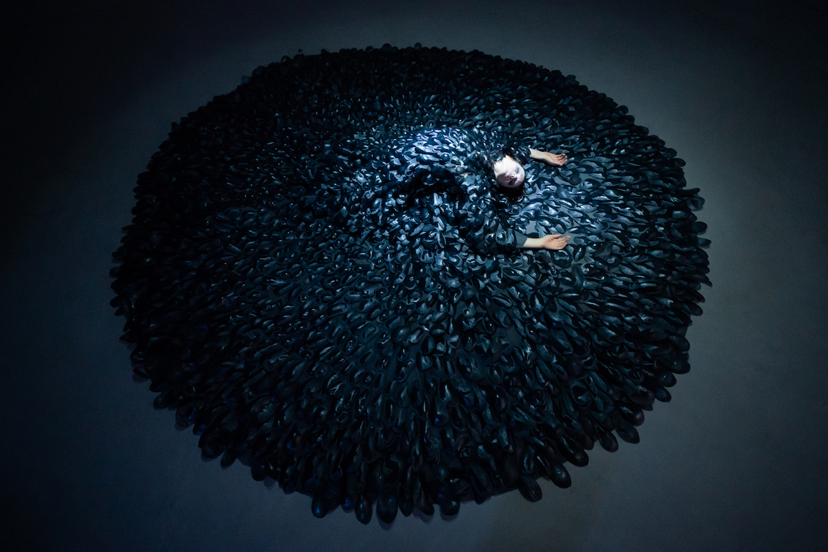 Twee danseressen liggen als bewegende sculpturen uitgestald op zwarte plateaus, in innige verstrengeling met mechanische wormachtige wezens. Een andere vrouw lijkt in co-existentie te leven met een berg krioelende ‘mosselen’ die haar lichaam omkleden als een galajurk. Roerloos ligt zij in die ritselende hoop. Alleen haar hoofd en handen steken uit. Haar rug is vervaarlijk gekromd, haar armen hangen naar achteren en haar ogen en mond zijn wijd opengesperd.
