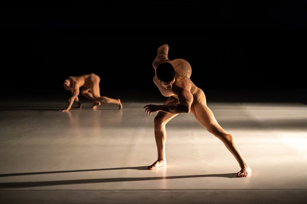 Vanuit de schaduw betreden twee dansers een uitgelicht vierkant. Bobbelende siliconepakken vervormen hun afgetrainde lichamen, waardoor ronde uitstulpingen zijn ontstaan op ongewone plekken. Ze voeren een schokkige synchroondans uit, als doorgefokte, gekloonde laboratoriumdieren die zojuist voor het eerst op vrije voeten zijn gesteld. Na enkele minuten verdwijnen ze weer in de schaduw waar ze even daarvoor uit tevoorschijn waren gekomen.