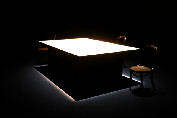 Door Janssens’ oeuvre ontrolt zich een voorkeur voor theater dat de nadruk legt op het woord. Spelers groeien op scène zichtbaar naar elkaar toe, doen dat met compacte gebaren, en ogen steeds meer bereid tot onderling en intiem contact. Ook FAMILY heeft diezelfde opzet. Centraal op het toneel staat een lange houten keukentafel. Het tafelblad is volledig leeg, ongedekt. Het is het enige decorstuk en het tekent zich af tegen een zwart vierkant doek dat de achtergrond vult als een projectiescherm. De tafel en het doek lijken elementen waarop de verhalen die volgen zich spiegelen. De scène ademt en geeft ruimte, de spelers vullen die in.