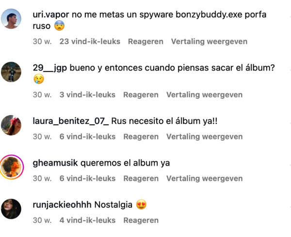 Het regende al gauw reacties op Rusowsky’s post. Sommige fans maanden hun idool aan om zijn tijd niet te verdoen met rare video’s, maar eindelijk zijn langverwachte debuutalbum te releasen. Andere volgers gaven dan weer geërgerd aan geen spyware te willen ontvangen. Weer anderen bedankten Rusowsky net voor de onverwachte nostalgietrip die de zingende aap op hun smartphonescherm had uitgelokt.