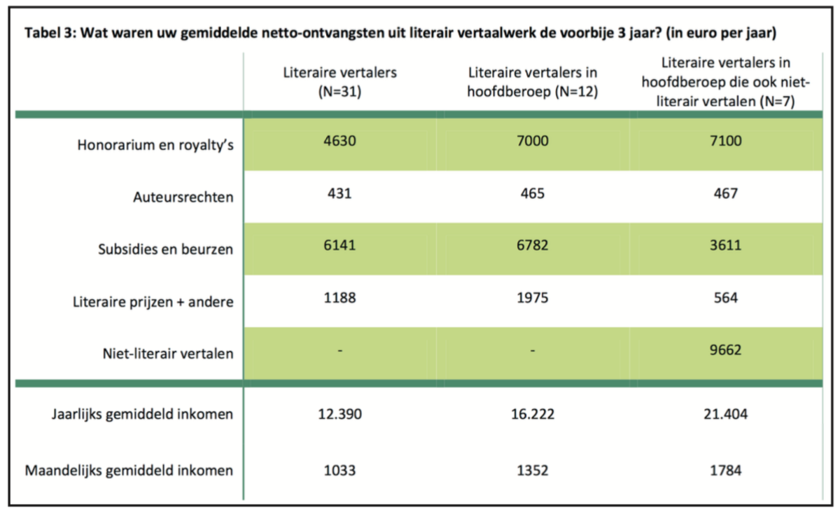 Met inbegrip van subsidiebeurzen dikt het gemiddelde jaarinkomen van literaire vertalers in hoofdberoep dan wel aan tot 16.222 euro, maar dan nog is dat opvallend lager dan bij Nederlandse collega-vertalers (27.166 euro netto per jaar in 2013-2014, volgens het Inkomensonderzoek schrijvers en vertalers uit 2016). Van de groep Vlaamse literaire vertalers is er dan ook maar een klein deel dat zich uitsluitend met literair vertalen kan bezighouden.