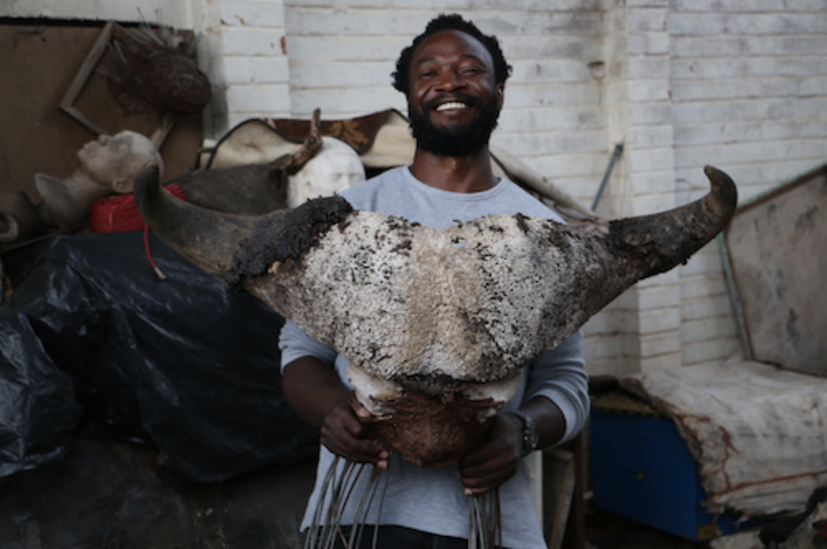 Rond Davids huis liggen allerlei kunstwerken, waaronder een buffelschedel waaraan hij lange voelsprieten heeft gelast. Hij houdt het voor zich als een masker. ‘Vroeger werden buffelmaskers enkel gebruikt door het zuidelijk Afrikaanse Ngoni-volk. Ze verwezen naar sterke mensen die een belangrijke positie hadden in de gemeenschap. Zij gedroegen zich als buffels: ze waren krachtig, maar leefden harmonieus samen en beschermden hun groep.