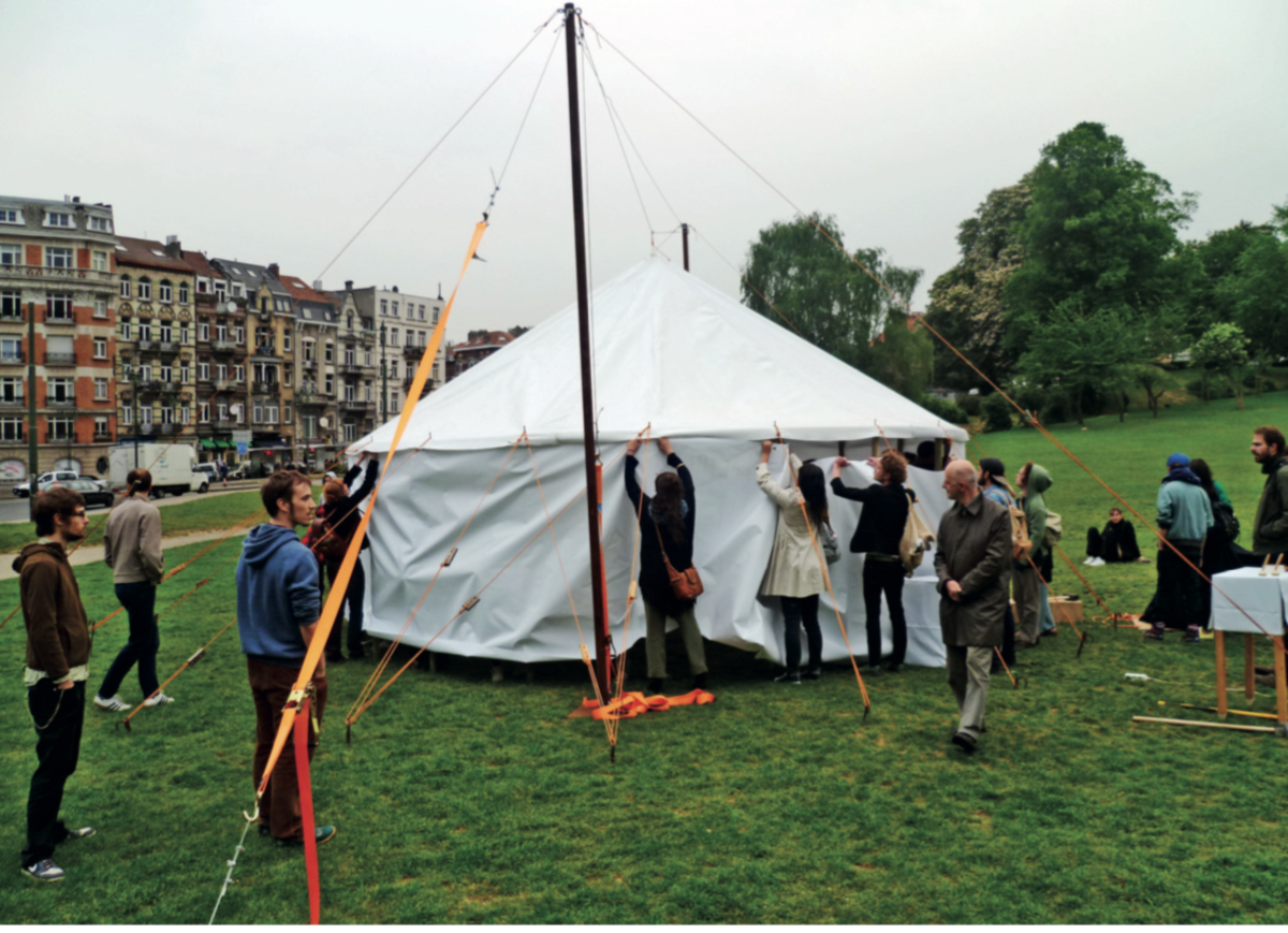 De kunstenaar is een van de spelers die telkens opnieuw het gevecht met gesloten gemeenschappen kan aangaan. ‘Maar dan moet je dat als kunstenaar wel echt durven’, aldus Vandevelde. ‘En die durf is er vandaag soms te weinig. Als kunstenaar moet je echt de regels resetten.’ Gielen vertrekt van het model van het circus. ‘De kunstenaar komt als eerste aan en slaat de piketten op: hier claim ik publieke ruimte, of een idee, hier komt iets anders. Bij Recetas Urbanas zie je dat letterlijk. En dan gaat de kunstenaar discussiëren met de overheid over waar hij mag staan. Maar het circus is ook een economie, je moet ervan kunnen leven en zowel je vrienden en familie als professionelen zijn erbij betrokken. Als de kunstenaar werkelijk een publieke rol wil spelen, zal hij zichzelf heterogeen en collectief moeten organiseren. De individuele kunstenaar staat te zwak, en kan alleen maar opgeslorpt worden door de markt, alles behalve de commons dus.’