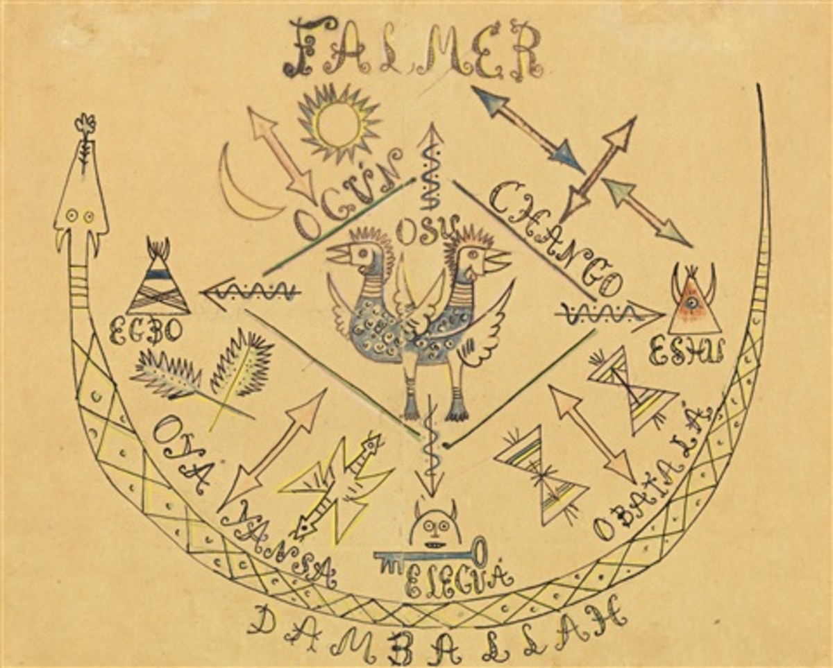 Lams Yoruba Pantheon beeldt de orisha’s af – heiligen uit de Santería en Yoruba religies. De tekening herinnert aan de ideografische, rituele grondschetsen uit de ruimere Afrikaanse diaspora – zoals de vévé in de Haïtiaanse Vodun en pontos riscados in de Braziliaanse Candomblé en Umbanda – waarvan de symbolische markeringen niet alleen verschillende goden voorstellen, maar ze ook oproepen.