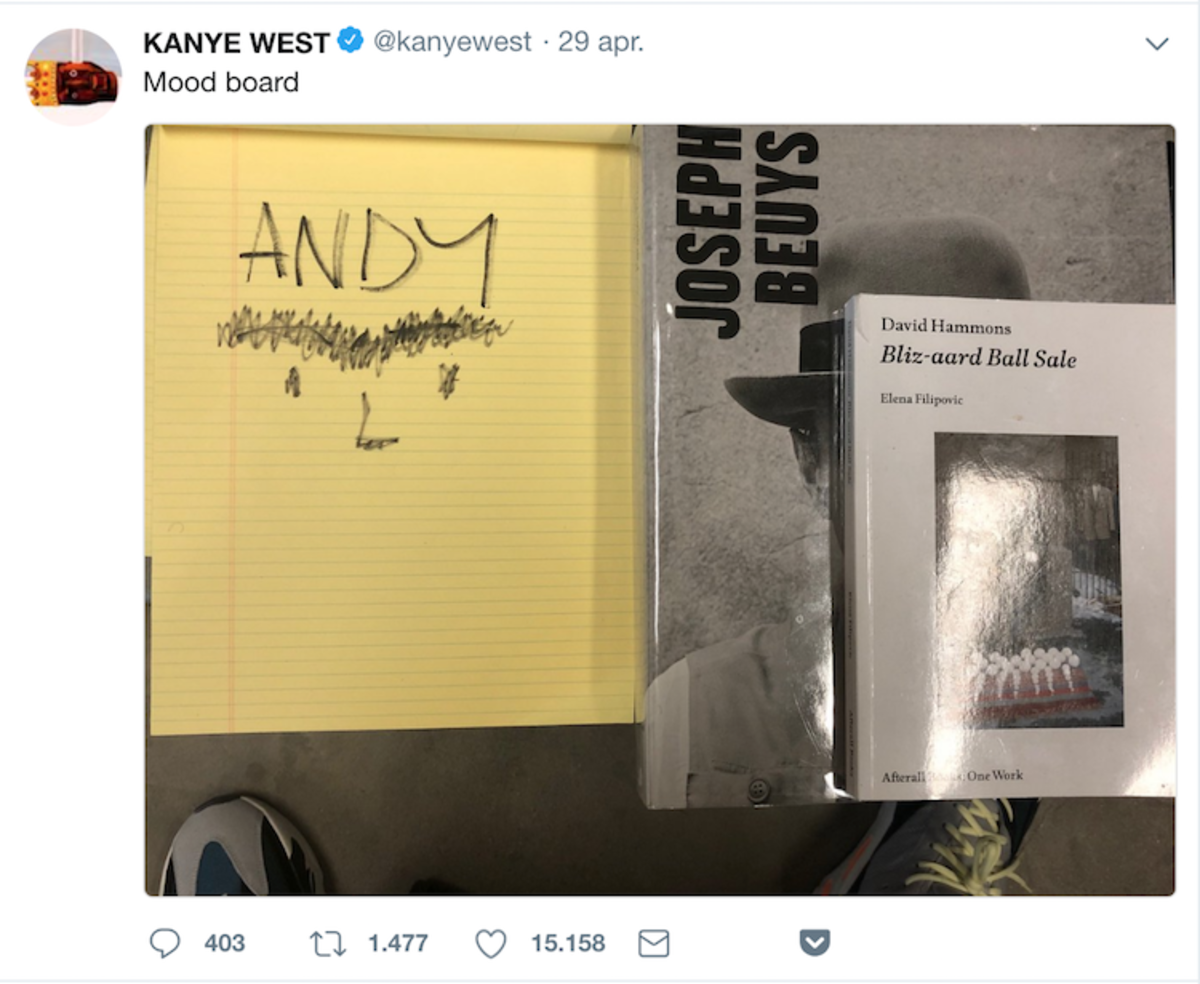 Enkele weken geleden postte Kanye West een foto op Twitter met de caption ‘mood board’. Op de foto stonden een schets van Andy Kaufman, een boek over David Hammons, Bliz-aard Ball Sale, én een boek over Joseph Bueys. Wie zijn deze mensen? Andy Kaufman is natuurlijk de beruchte comedian die weigerde een lijn te trekken tussen het leven op en naast het podium. Hij deed zich jarenlang voor als worstelaar en vrouwenhater, of zijn politiek incorrecte alter ego Tony Clifton. Ook stond Kaufman bekend om zijn gibberish-liedjes, die hij tijdens optredens met bongo’s uitvoerde – liedjes die de geestelijke ouders van Wests recente nummer Lift Yourself zouden kunnen zijn (deze diss-track werd intussen weer offline gehaald door West).
