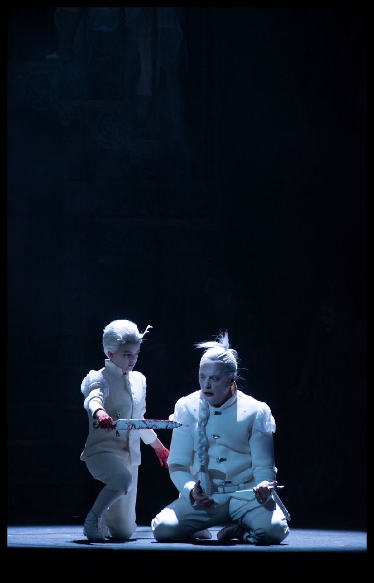 Zo vergaat het hem en zijn vrouw ook bij Dusapin: naarmate de heksen hen hun misdaden doen re-enacten, wordt het paar almaar wanhopiger. Ook in de opera, treffend gestileerd als een aderlating, berooft Lady Macbeth zich van het leven, terwijl Macbeth omkomt aan iets wat ‘patricide’ genoemd kan worden – daarover later meer.