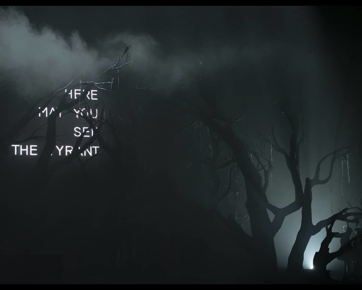 Het openingsbeeld toont een knoestige dode eik, die zo lijkt weggeplukt uit Tim Burtons film Sleepy Hollow (1999). In Burtons macabere sprookjeswereld is de boom de schuilplaats van een duistere ruiter die koppensnelt. Ook in Macbeth Underworld heeft de boom iets met onthoofdingen, want ernaast hangen felle neonletters die ‘Here may you see the tyrant’ spellen.