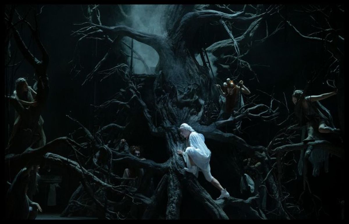 Is dat dan werkelijk het eindbeeld van de voorstelling? Zien we een flashback of gaat de vertelling achterwaarts? Voor het antwoord treedt een personage op scène tussen de grote kromme takken van de eik. Het is Hekate, de Oud-Griekse godin van de geesten en de nacht. Ze zegt: ‘They are going to sing again and again. The silent things they did. Oh yes, something has to be done again.’