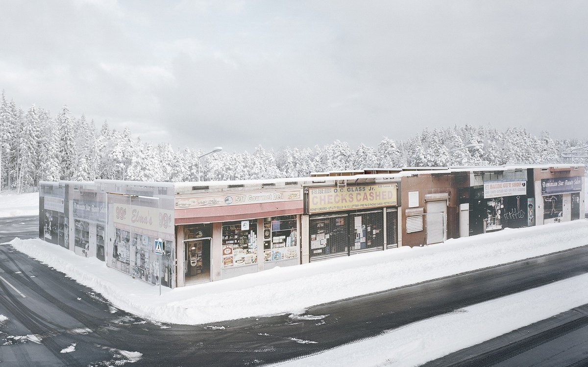 Ook in de buurt van Göteborg, op de testsite AstaZero voor geautomatiseerde navigatiesystemen voor wagens, stootte de fotograaf op wel heel vreemde Potemkin-gevels. Te midden van de sparrenbossen en de sneeuw duiken daar in Zweden plots fotorealistische, zeer gedetailleerde replica’s van winkelstraten uit het New Yorkse Harlem op, met een gift shop, een kapsalon, een apotheek en een gourmet deli. Qua ongerijmdheid kan die combinatie tellen. Deze beelden bevreemden door hun onophoudende pendelbeweging tussen echt en onecht, realiteit en illusie.