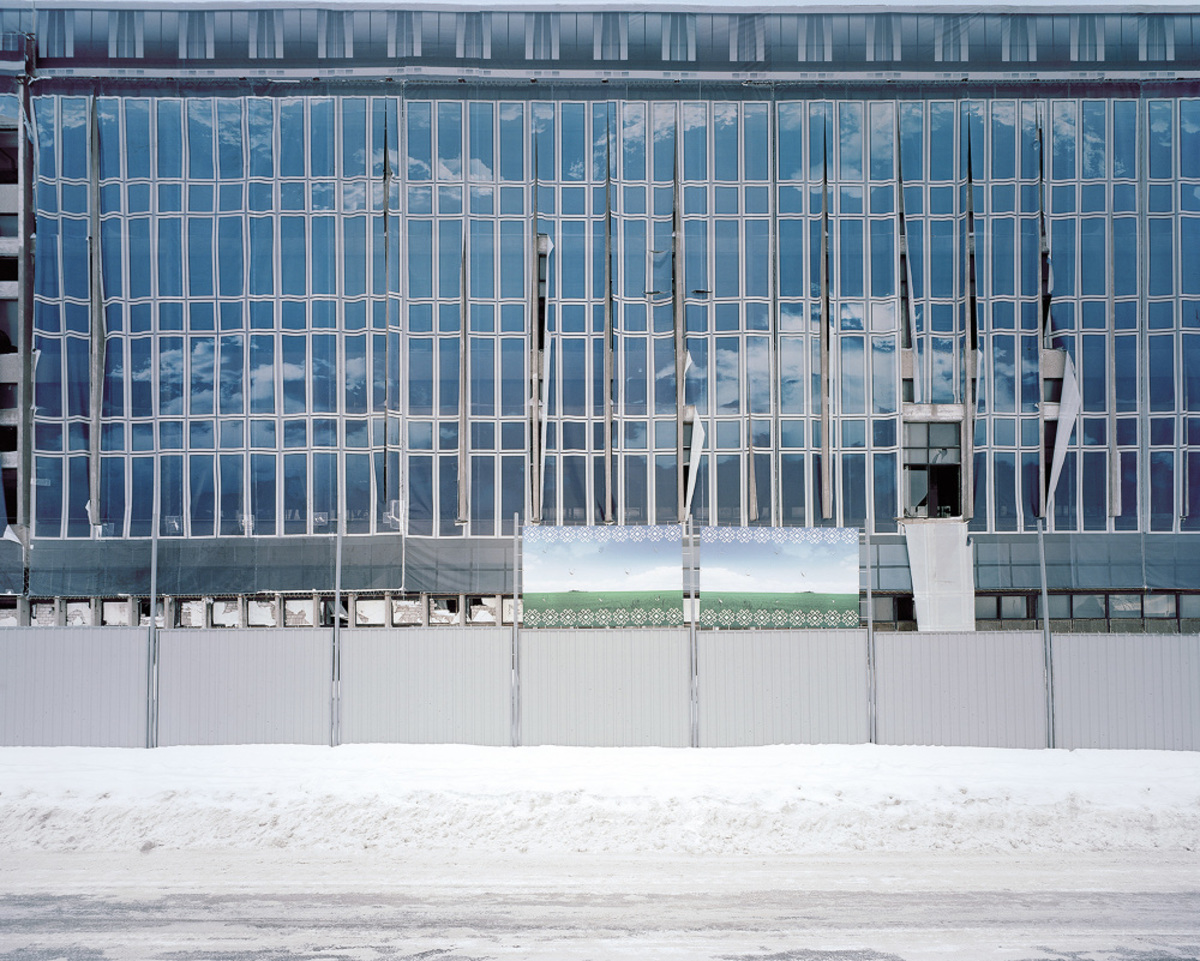 Geholpen door de formele rigiditeit van het gefotografeerde motief vormt de cover van The Potemkin Village meteen al het meest abstracte én meest symbolische beeld: de façade van een leegstaand kantoorgebouw in de Russische miljoenenstad Oefa, volledig overtrokken met zeildoeken. Samen roepen die doeken een strakke Mies van der Rohe-achtige gevel van staal en glas op – staalblauwe hemel en wolkjes incluis. Alleen heeft de wind stukken van de kunststof losgewrikt en piept het uitgeleefde, verdekte complex er onderuit.
