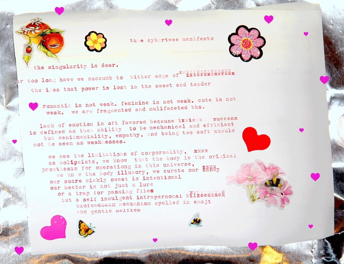 De niet voor de hand liggende combinatie van deze twee esthetische stromingen geeft beide componenten een nieuwe gelaagdheid. Zowel het manifest als de artistieke praktijken van de leden van Cybertwee compliceren het zachte, naïeve en sentimentele van twee door te benadrukken hoe technologie onze relaties, affecten en zoektocht naar connectie steeds meer medieert. Subtiel problematiseren ze dus het verlangen naar onschuld en authenticiteit, een essentieel onderdeel van twee.