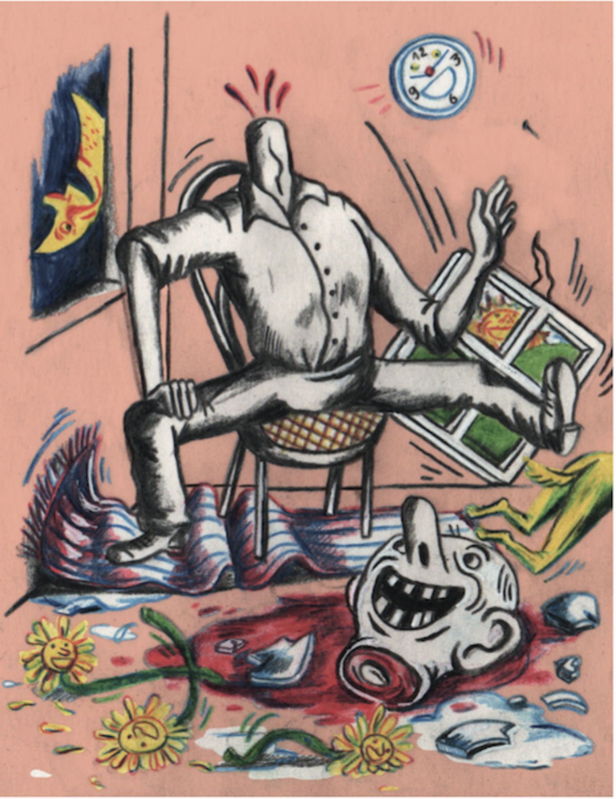 Wat mij het meest treft aan mijn eigen lach – dus niet de glimlach, die vrucht van zelfbeheersing, dat diplomatenfoefje – is het uitstel van het vermogen tot reflexiviteit. De aanleiding voor de lach lost op in de lach zelf. Daarmee lijkt de lach nogal op het orgasme: ontlading. Jim Carrey, de van origine Canadese komiek, beschouwde het orgasme juist als vlucht, een vorm van escapisme zelfs. In zijn stand-upshow Unnatural Act (1991) zei hij er het volgende over: ‘And the only time I forget all of my problems, is when I am right smack dab in the middle of a sexual orgasm. (…) To me an orgasm is like a mini vacation. But it is better because you cannot think about anything while you are having one. (...) For thirty seconds, man, you are free.’