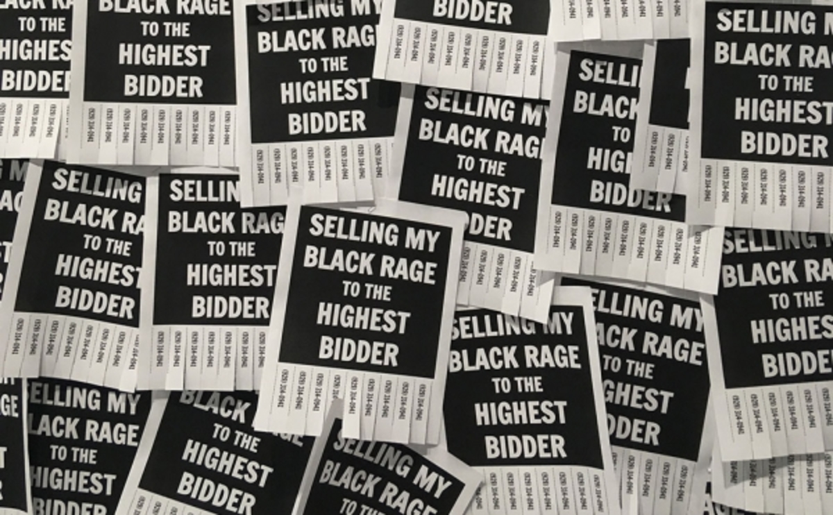 ‘Ik denk aan die boeiende slogan die de Amerikaanse schrijfster en kunstenaar Kameelah Janan Rasheed op posters en zoekertjes drukt: Selling my black rage to the highest bidder. Daarmee vertelt ze niet alleen dat zelfs de meest radicale affecten te kapitaliseren vallen, maar plaatst ze zich als kunstenaar ook middenin de stroom van haar eigen economie. Ze wil niet langer alleen de handelswaar zijn, zoals de tot slaaf gemaakte, maar ook de onderhandelaar zelf.