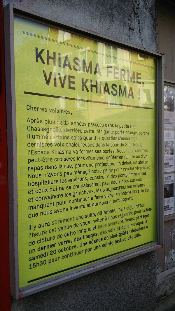Denk opnieuw aan die instabiele alliantie van het Comité Adama met de Gele Hesjes: een onvoorspelbare botsing van twee krachten die er niet horen te zijn, een nieuwe harmonieuze sonoriteit vanuit twee vermeende kakofonieën, die samen een stem vormen die men nog nooit gehoord heeft. Net zulke plekken moeten we vandaag vormgeven, concreet en poëtisch tegelijk. En blijvend in wording, zonder zich uit te kristalliseren in organisaties, reglementen of marktwaarde. Met Khiasma hebben we zo’n onafhankelijke plek gecreëerd. Net als La Colonie en andere plekken van vandaag creëert ze specifieke waarden vanuit een specifiek standpunt.’