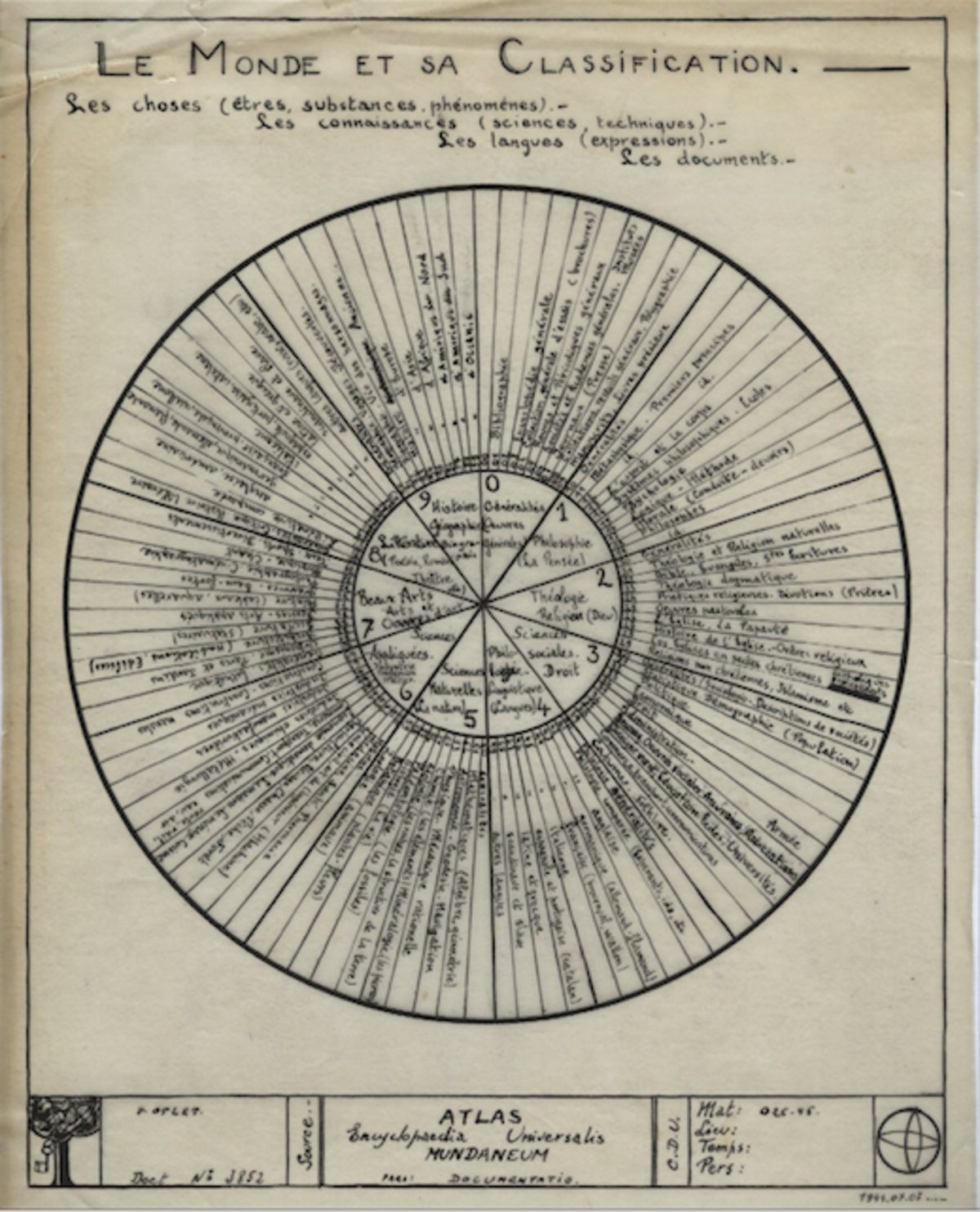 Om hun verzameling bruikbaar te maken, ontwierpen Otlet en La Fontaine een nieuw bibliografisch systeem: de Universele Decimale Classificatie. Elke tekst wordt geclassificeerd onder een thema dat een bepaald nummer krijgt toegewezen. Dat begint met een heel algemene opdeling in tien fundamentele thema’s, met een cijfer van 0 tot 9: Ouvrages généraux, Philosophie, Théologie/Religion, Sciences sociales/Droit, Philologie/Linguistique, Sciences pures, Sciences appliquées, _Beaux-Arts, Littérature, Histoire en Géographie. De tien bouwstenen voor de Bildung van mens en maatschappij.