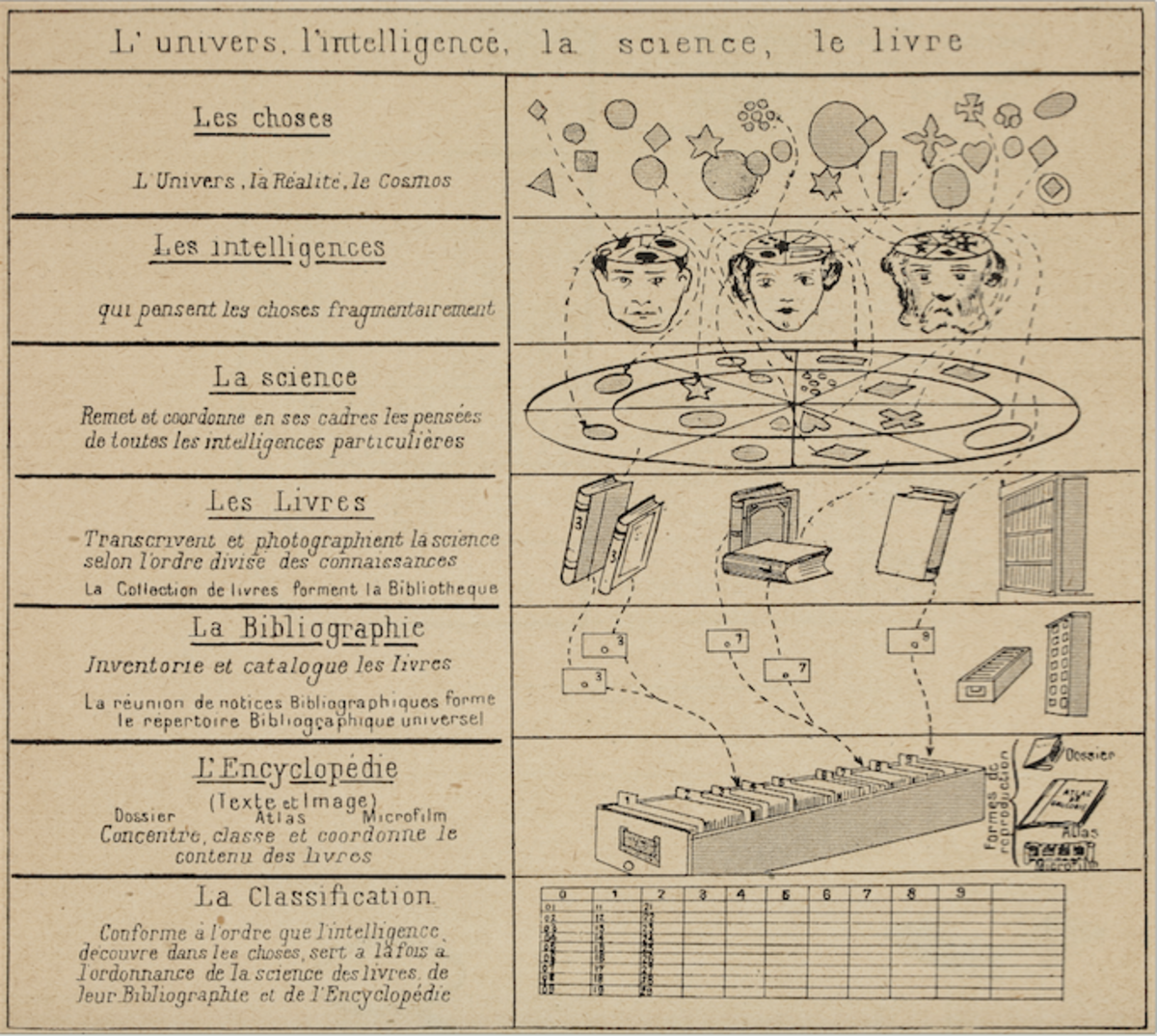 ‘De mensheid staat op een keerpunt in haar geschiedenis. De hoeveelheid aangemaakte data is gigantisch. Nieuwe instrumenten zijn nodig om ze te vereenvoudigen, te condenseren, anders zal onze intelligentie de obstakels waar ze mee worstelt nooit te boven komen, noch de vooruitgang boeken die wij voor ons zien en waarnaar wij hunkeren.’ (Otlet, in 1934, in zijn Traité de documentation)