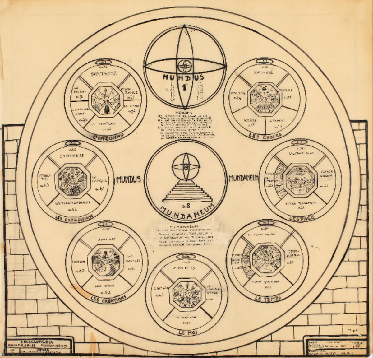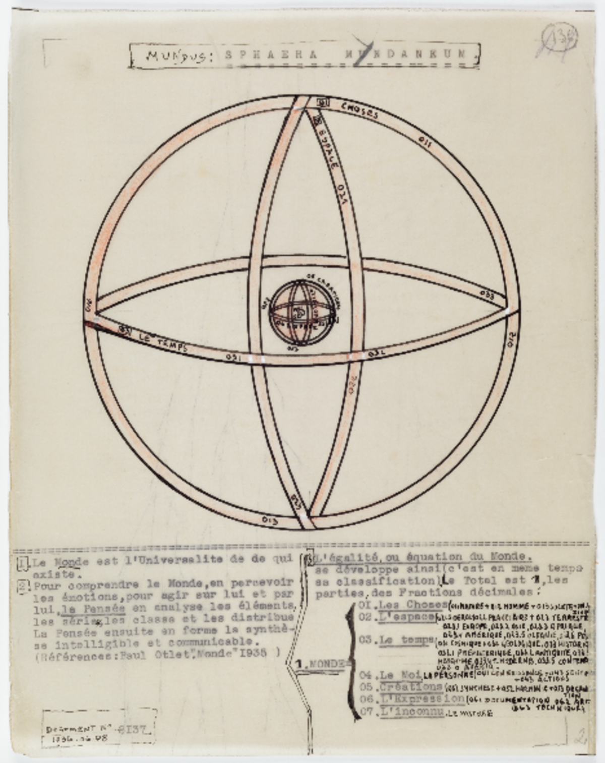 Op deze tekening van Otlet kan je zien hoe het classificatiesysteem via steekkaarten in archiefkasten naar wetenschappelijke boeken leidt. Er is een tamelijk eenduidig verband tussen L’Univers, La Réalité, Le Cosmos en La Classification. Naast vrede in de wereld had het project van Otlet en La Fontaine dus de bedoeling om via classificatie en synthese de wereld te begrijpen. In de middelste cirkel op de tekening van de Atlas zien we dan ook hoe het Mundaneum, in de vorm van een piramide, de mens in staat zou moeten stellen om vanuit de onderste trede op te klimmen naar boven, naar de Sphaera Mundaneum: de ultieme synthese die tegelijk het ultieme inzicht is in de wereld.