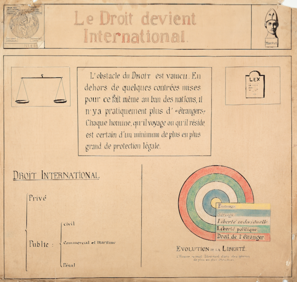 We zien een aantal van de posters die samen de Encyclopaedia Universalis Mundaneum vormden. Er staan vooral veel tekeningen en illustraties op. Otlet wilde niet alleen de veelheid aan informatie tot een eenheid brengen, hij wilde die eenheid ook bij zo veel mogelijk mensen krijgen, en hij geloofde dat posters daarin het best zouden slagen. Het Mundaneum moest uiteindelijk tegelijk een wereldbibliotheek, een wereldmuseum en een werelduniversiteit worden. Het project zou via een ‘recapitulatie van de wereld’ bijdragen tot de ‘evolutie van de wereld naar het doel van universele samenwerking’ (zo stelt Otlet het in 1925 in een publicatie van de door hem opgerichte Union des Associations Internationales). Schematiserend werkte Otlet vanuit zijn bibliotheek aan niets minder dan aan de wereldvrede.