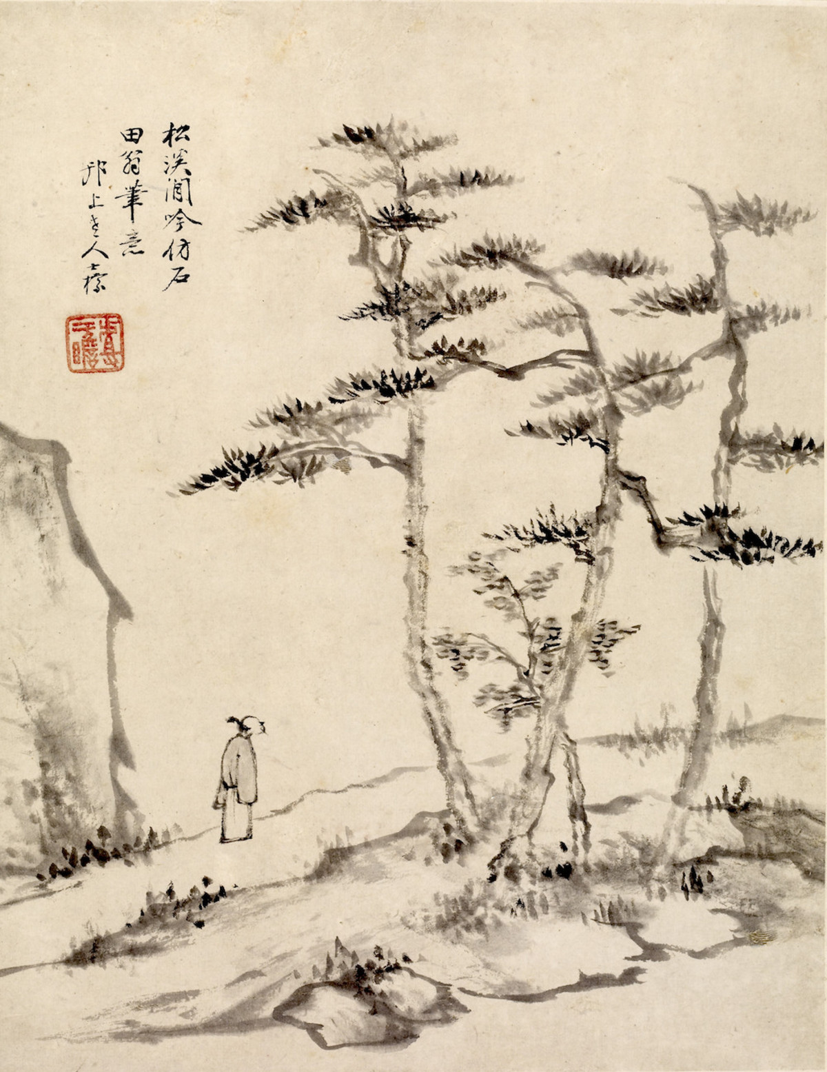 De sublieme ervaring van de natuur beschrijven was echter niet alleen voorbehouden aan de westerse Romantiek. De weergave van overrompelende landschappen bestond al langer in de kunst. Een voorbeeld daarvan is een oude Chinese prent uit ca. 1687, vervaardigd door Zha Shibiao (1615-1698). Een rotsachtig landschap met pijnbomen inspireert een wandelaar om gedichten te reciteren. Dit weten we enkel dankzij het opschrift op de prent, maar ook het beeld zelf loopt over van poëzie. De wandelaar staart in een ontwapenende en ontspannen houding naar een pijnboom.
